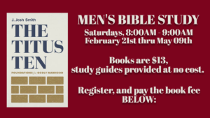 Join Pastor Frank as he facilitates a Men’s Bible study featuring J. Josh Smith’s book,”The Titus Ten”.